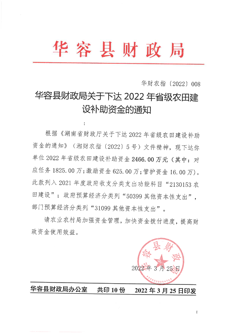 华容县财政局关于下达2022年省级农田建设补助资金的通知