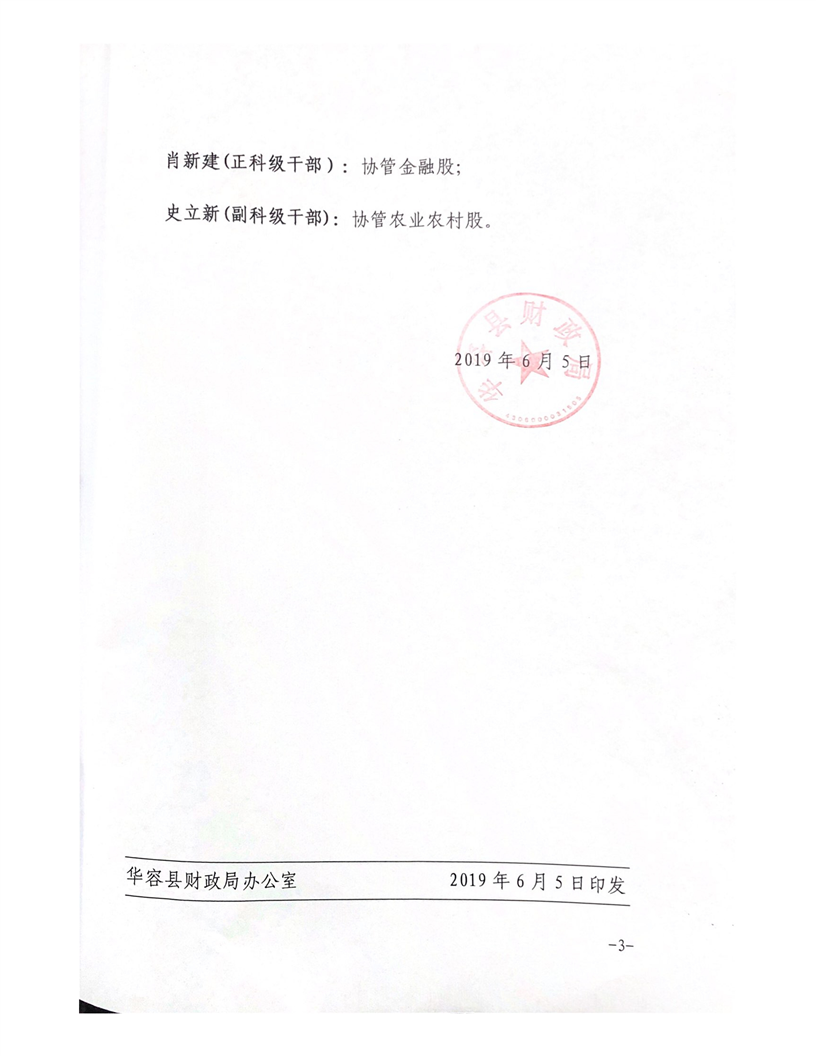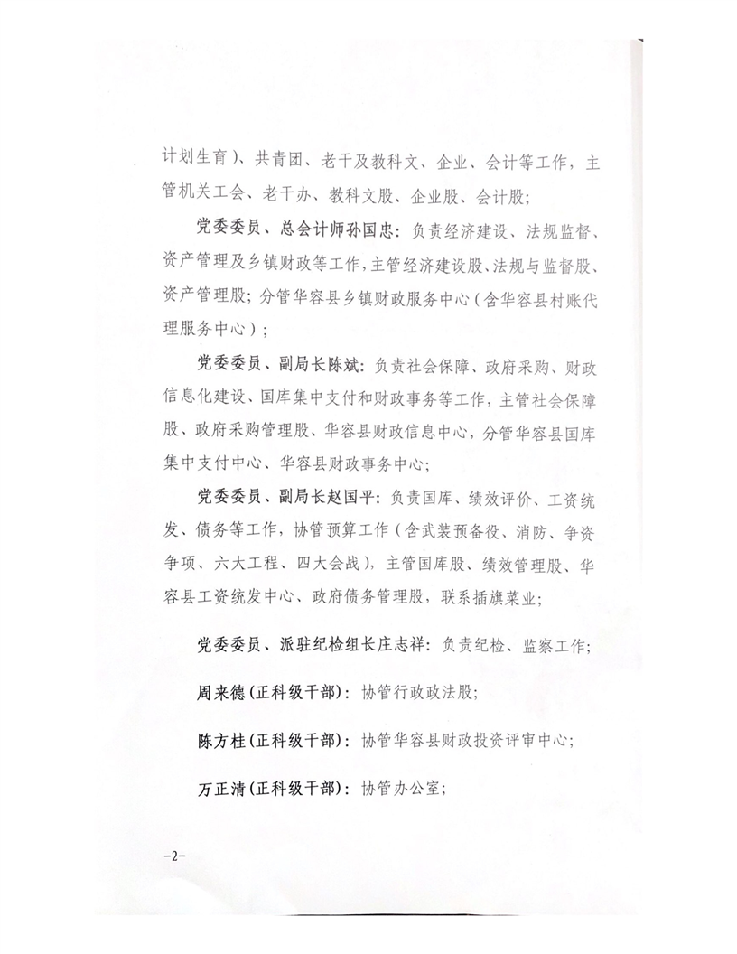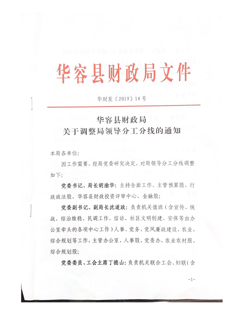 华容县财政局关于调整局领导分工分线的通知(华财发〔2019〕14号)