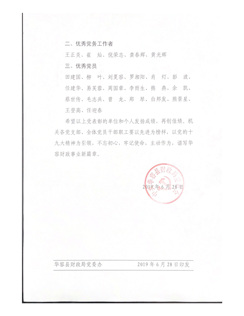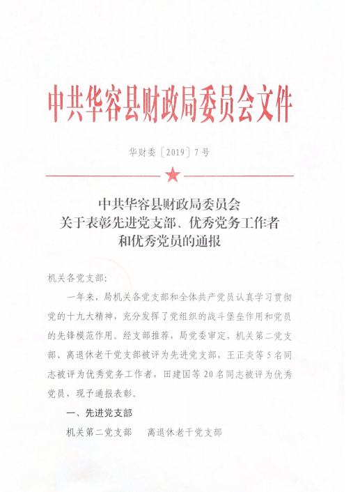 中共华容县财政局委员会关于表彰先进党支部、优秀党务工作者和优秀党员的通报(华财委〔2019〕7号)