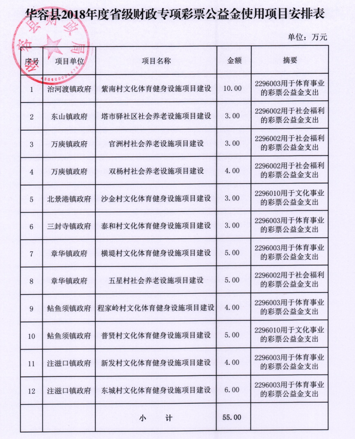 华容县2018年度省级财政专项彩票公益金使用项目安排表