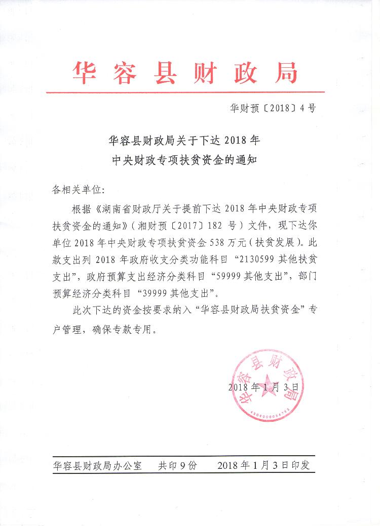 华容县财政局关于下达2018年中央财政专项扶贫资金的通知