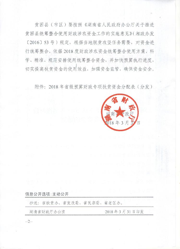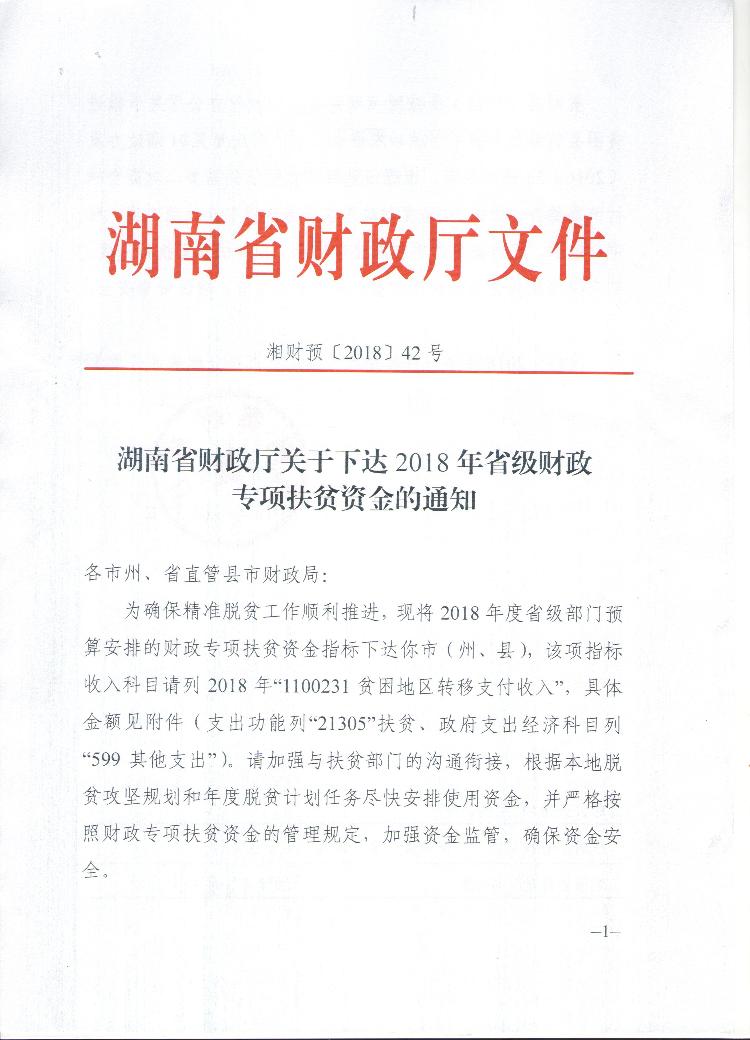 湖南省财政厅关于下达2018年省级财政专项扶贫资金的通知