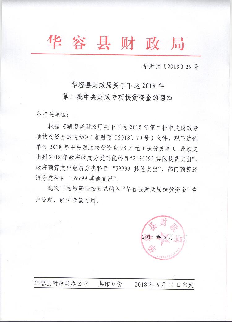 华容县财政局关于下达2018年第二批中央财政专项扶贫资金的通知
