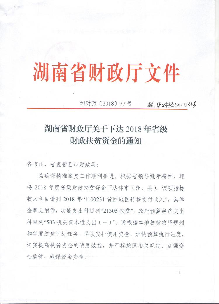 湖南省财政厅关于下达2018年省级财政扶贫资金的通知