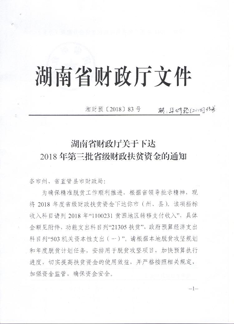 湖南省财政厅关于下达2018年第三批省级财政扶贫资金的通知