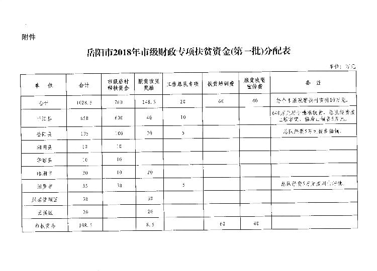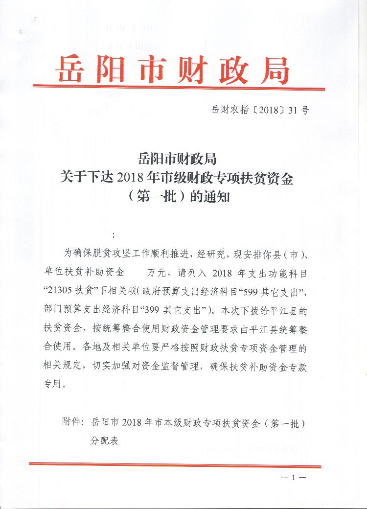 岳阳市财政局关于下达2018年市级财政专项扶贫资金(第一批)的通知