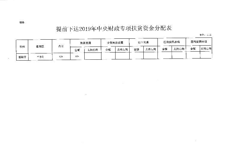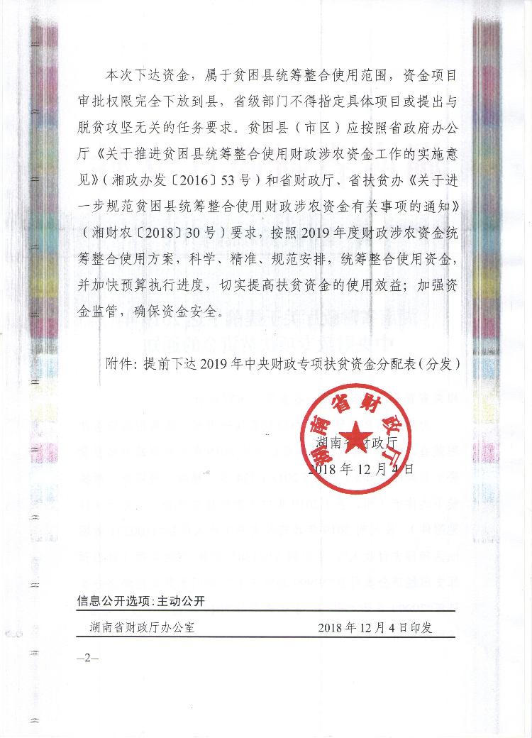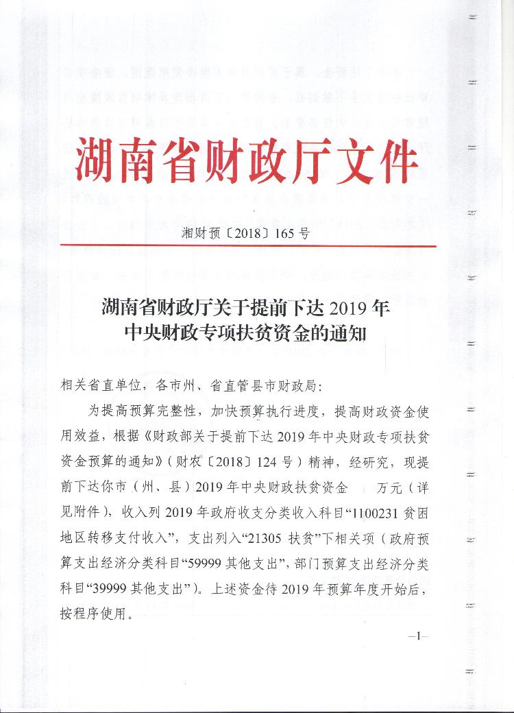 湖南省财政厅关于提前下达2019年中央财政专项扶贫资金的通知