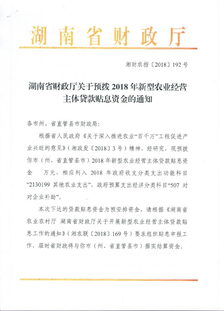 湖南省财政厅关于预拨2018年新型农业经营主体贷款贴息资金的通知