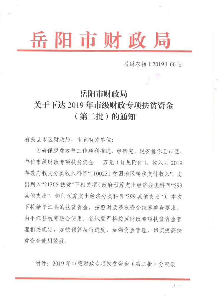 岳阳市财政局关于下达2019年市级财政专项扶贫资金(第二批)的通知