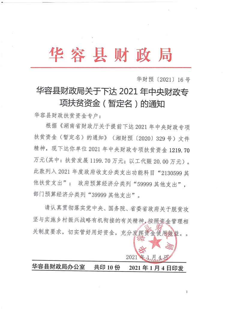 华容县财政局关于下达2021年中央专项扶贫资金(暂定名)的通知(华财预〔2021〕16号)