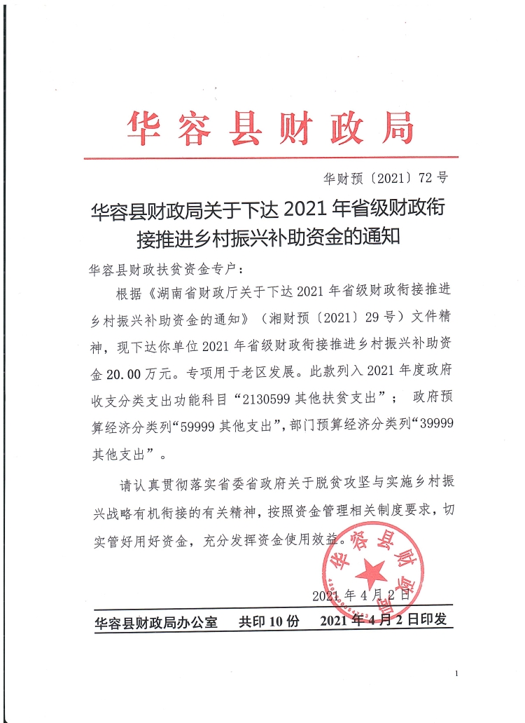 华容县财政局关于下达2021年省级财政衔接推进乡村振兴补助资金的通知(华财预〔2021〕72号)