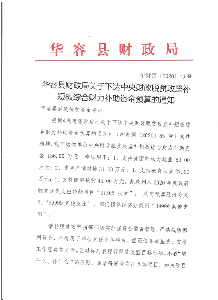 华财预〔2020〕79号华容县财政局关于下达中央财政脱贫攻坚补短板综合财力补助资金预算的通知