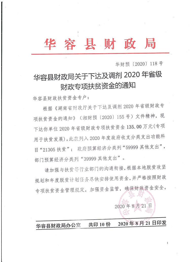 (华财预〔2020〕118号)华容县财政局关于下达及调剂2020年省级财政专项扶贫资金的通知