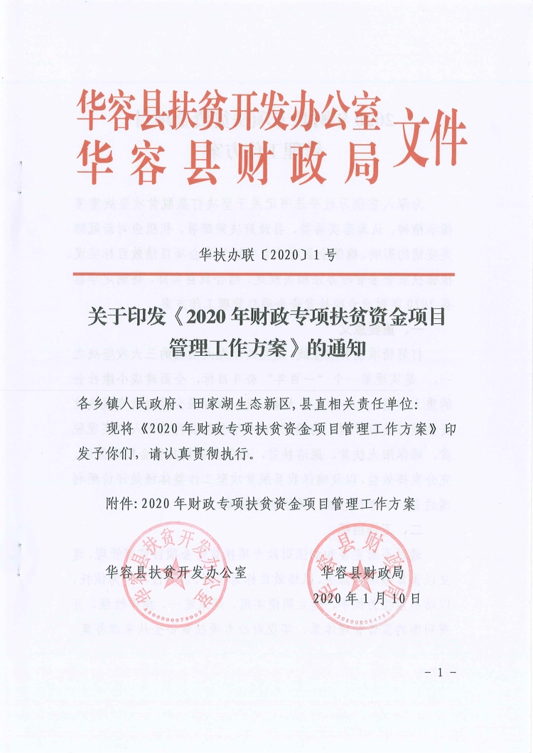 (华扶办联〔2020〕1号)关于印发《2020年财政专项扶贫资金项目管理工作方案》的通知