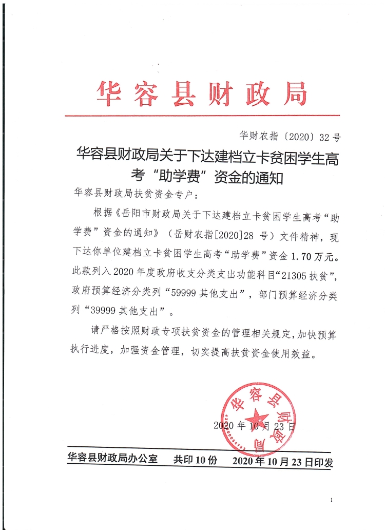 华容县财政局关于下达建档立卡贫困学生高考“助学费”资金的通知(华财农指〔2020〕32号)