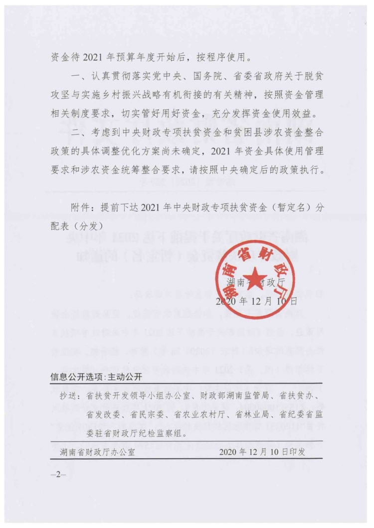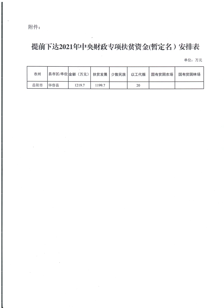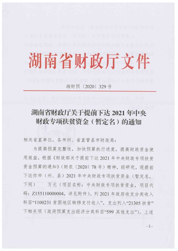 湘财预〔2020〕329号湖南省财政厅关于提前下达2021年中央财政专项扶贫资金(暂定名)的通知