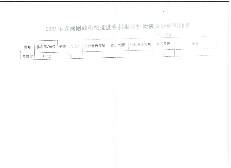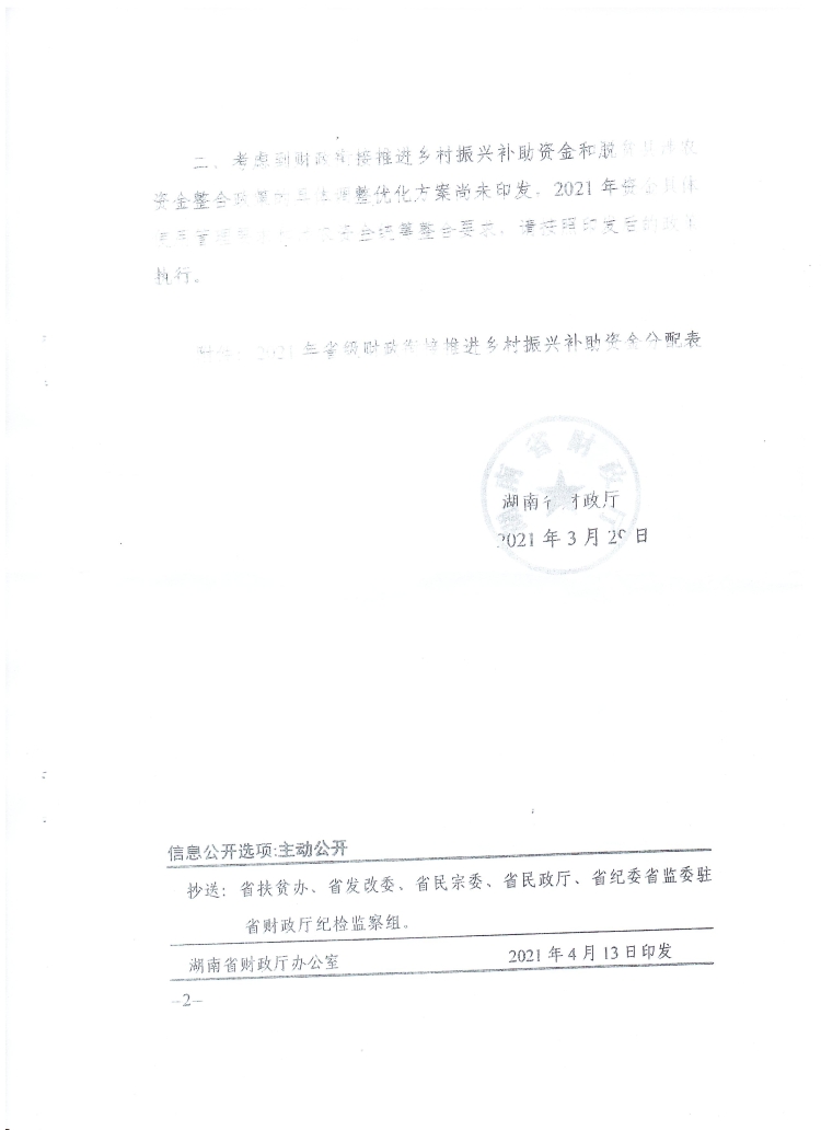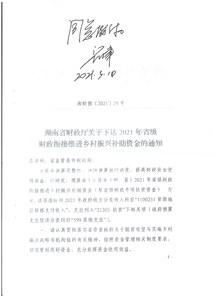 湘财预〔2021〕29号湖南省财政厅关于下达2021年省级财政衔接推进乡村振兴补助资金的通知