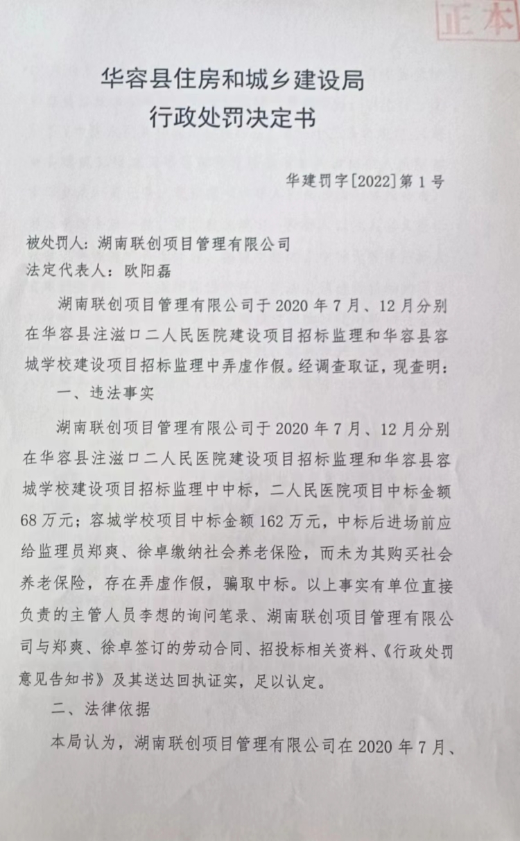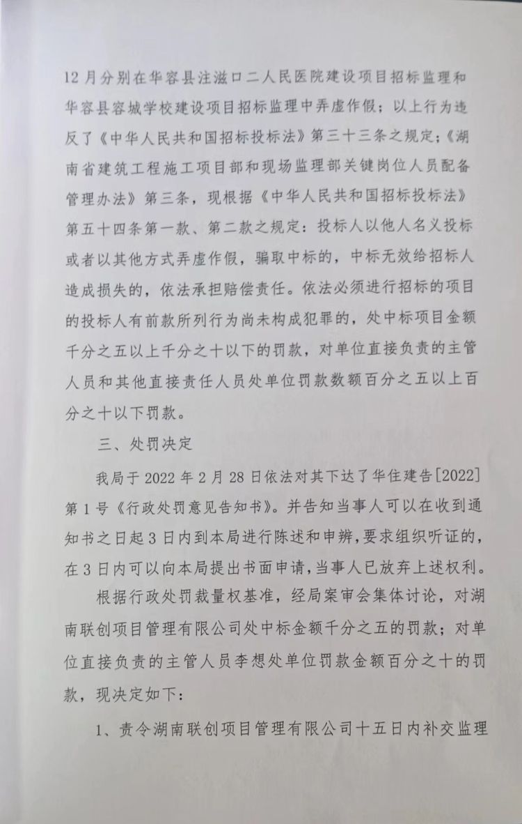 华建罚字(2022)第1号 湖南联创项目管理有限公司