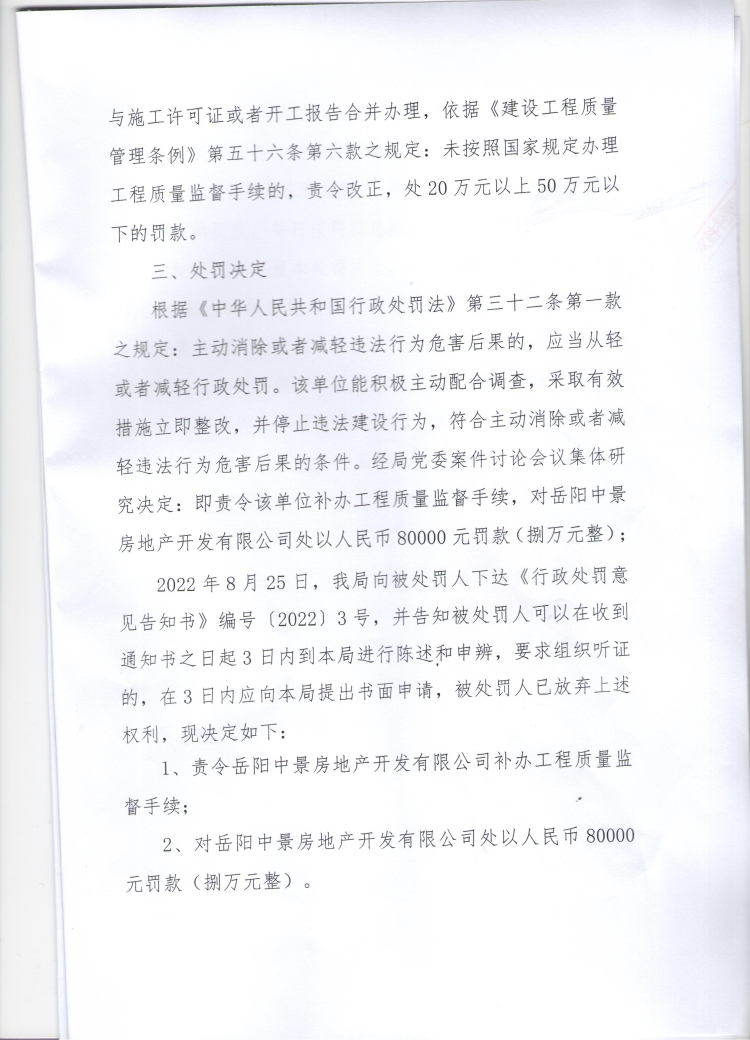 华建罚决字(2022)第3号 岳阳中景房地产开发有限公司