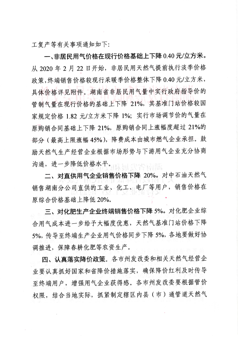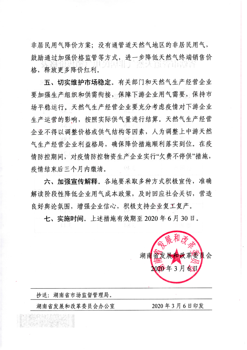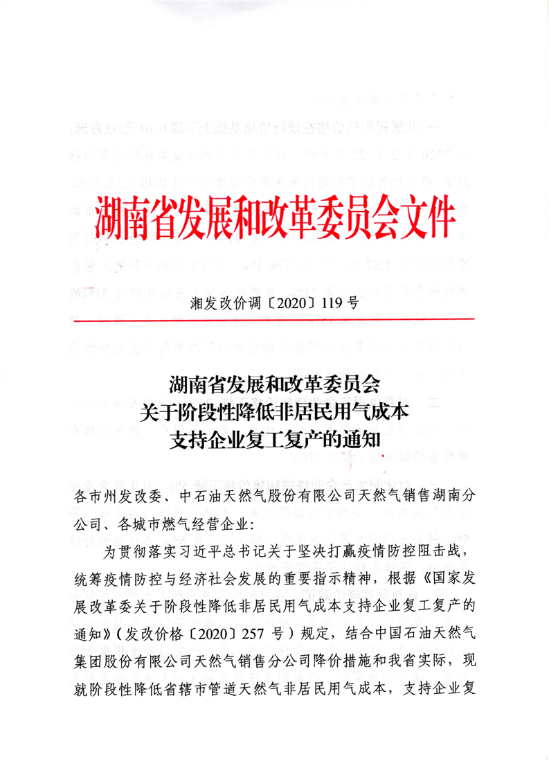 湘发改价调〔2020〕119号 关于阶段性降低非居民用气成本支持企业复工复产的通知