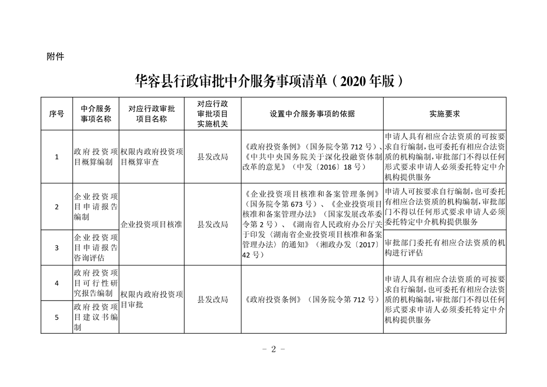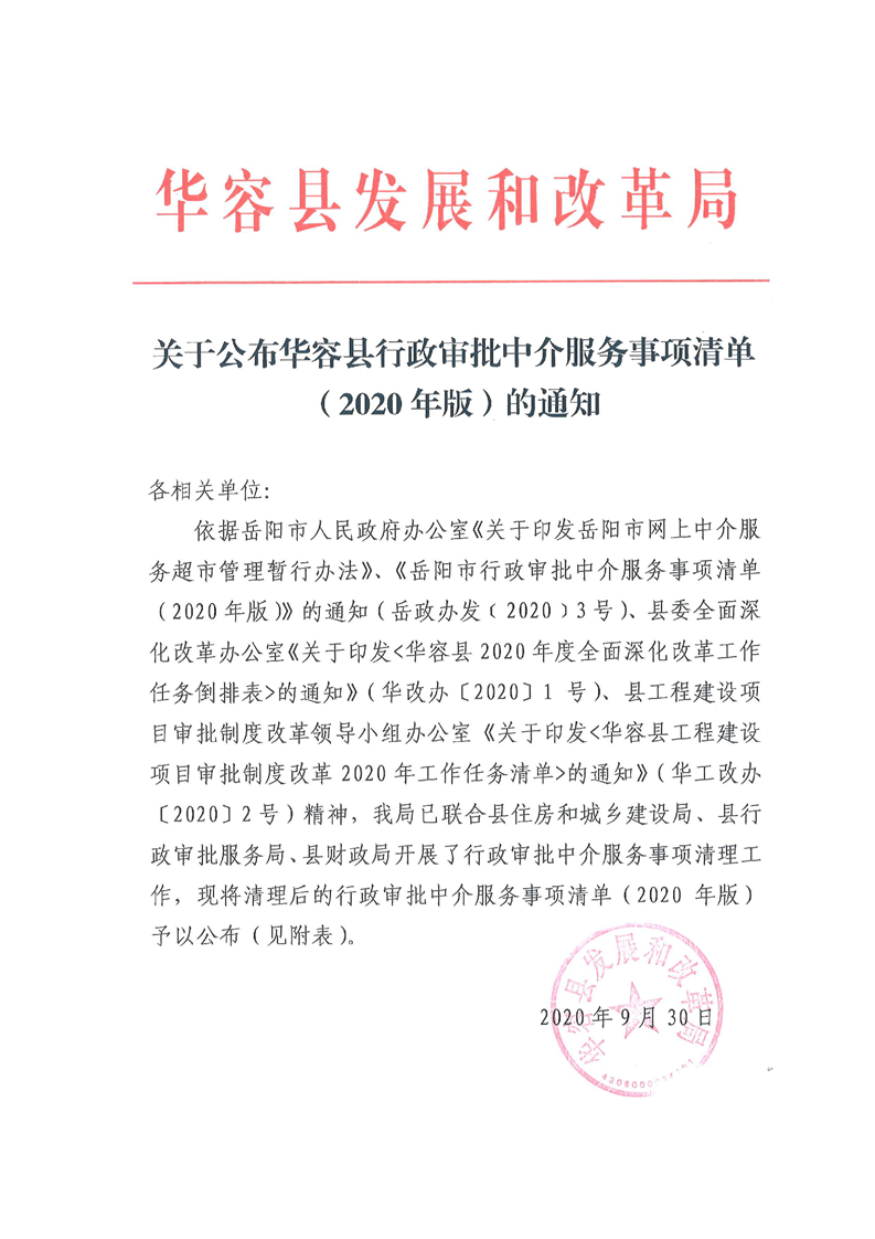 关于公布华容县行政审批中介服务事项清单(2020年版)的通知