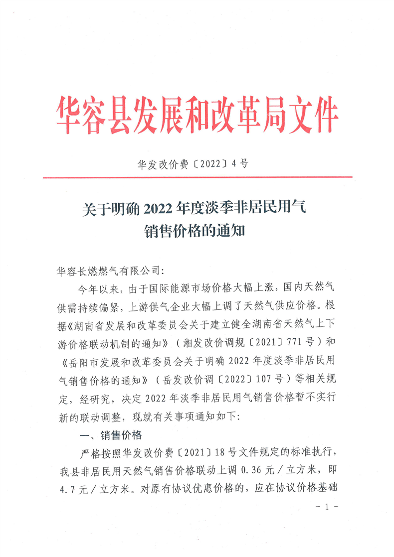 华发改价费[2022]4号 关于明确2022年淡季非居民用气销售价格的通知