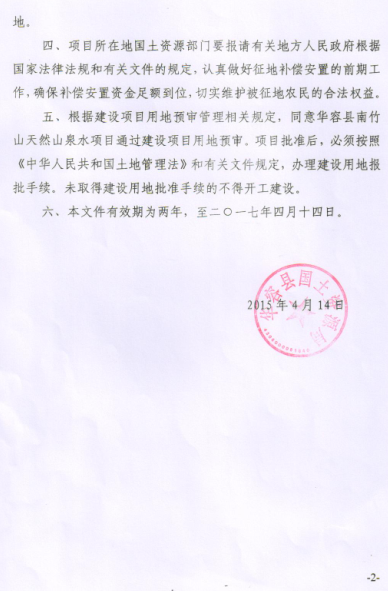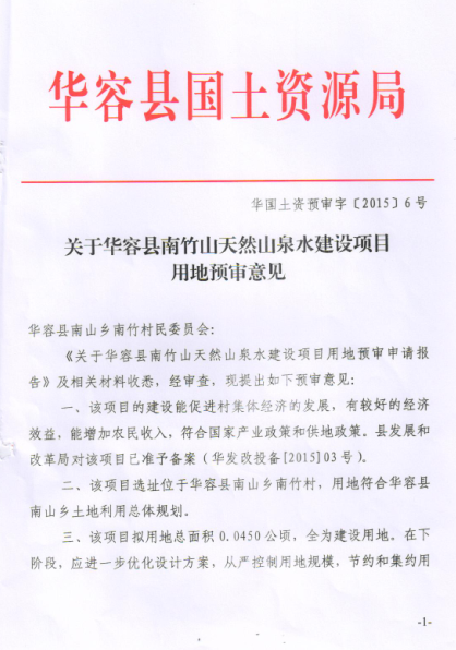 关于华容县南竹山天然山泉水建设项目用地预审意见