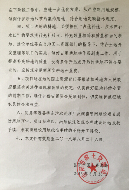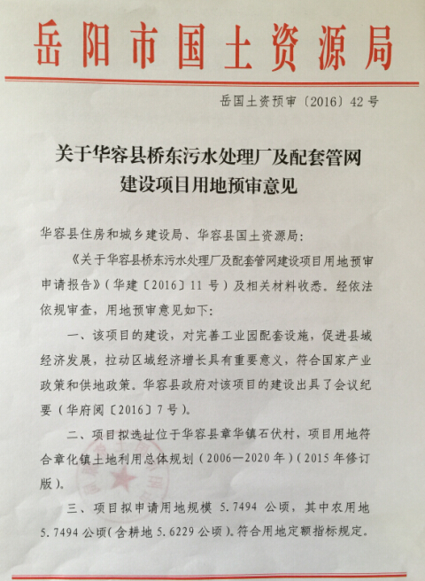 关于华容县桥东污水处理厂及配套管网建设项目用地预审意见
