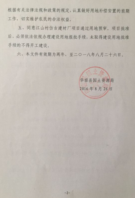 关于华容县东山镇江山村仿古建材厂项目用地预审意见
