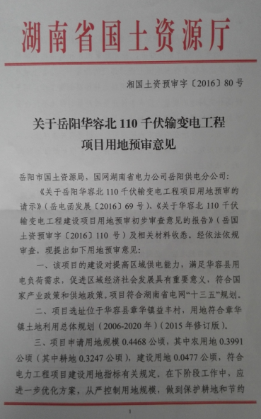 关于岳阳华容北110千伏输变电工程项目用地预审意见