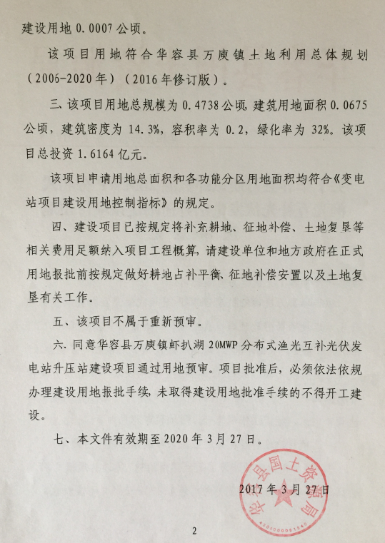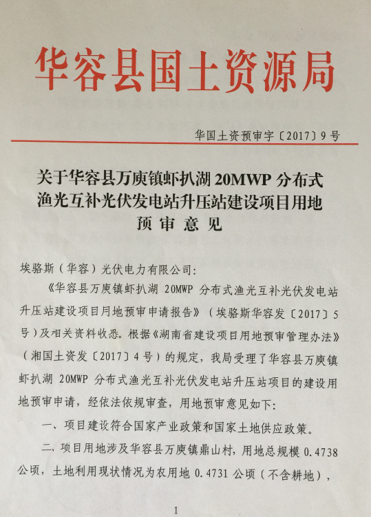 关于华容县万庾镇虾扒湖20MWP分布式渔光互补光伏发电站升压站建设项目用地预审意见
