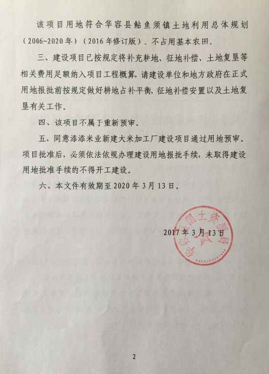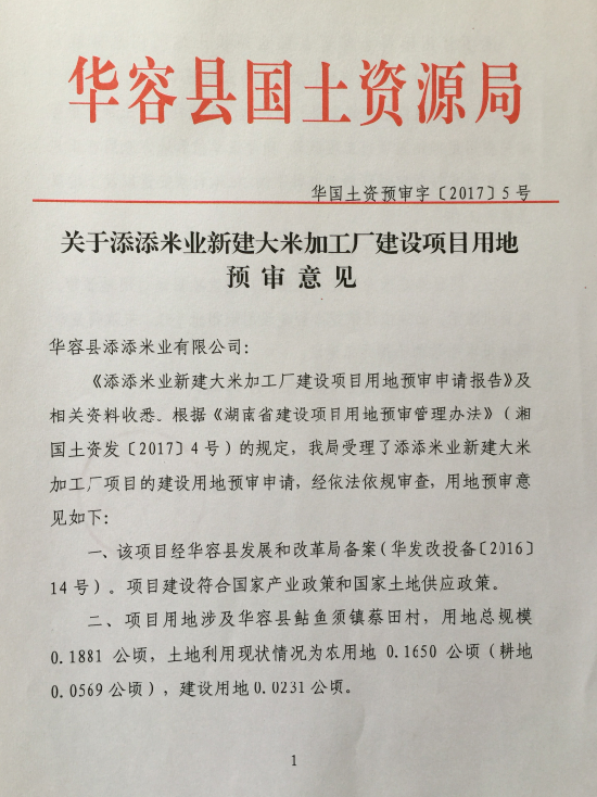 关于添添米业新建大米加工厂建设项目用地预审意见