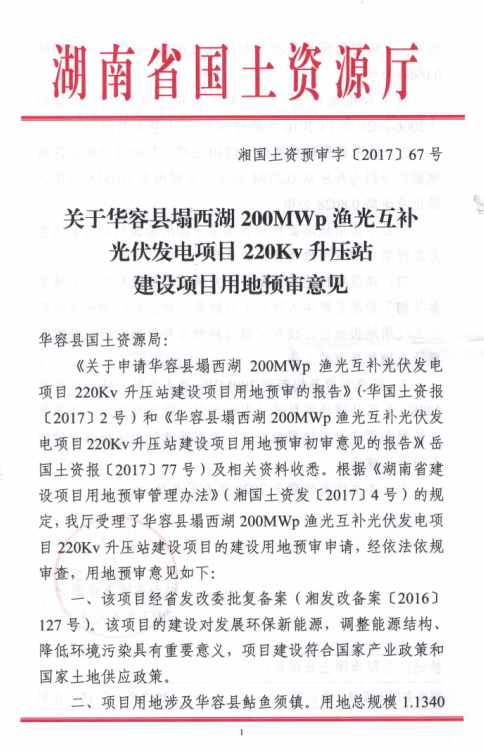 关于华容县塌西湖200MWP渔光互补光伏发电项目220KV升压站建设项目用地预审意见