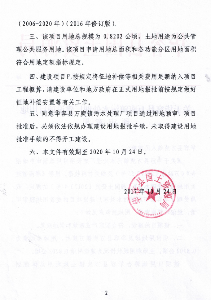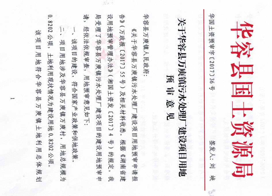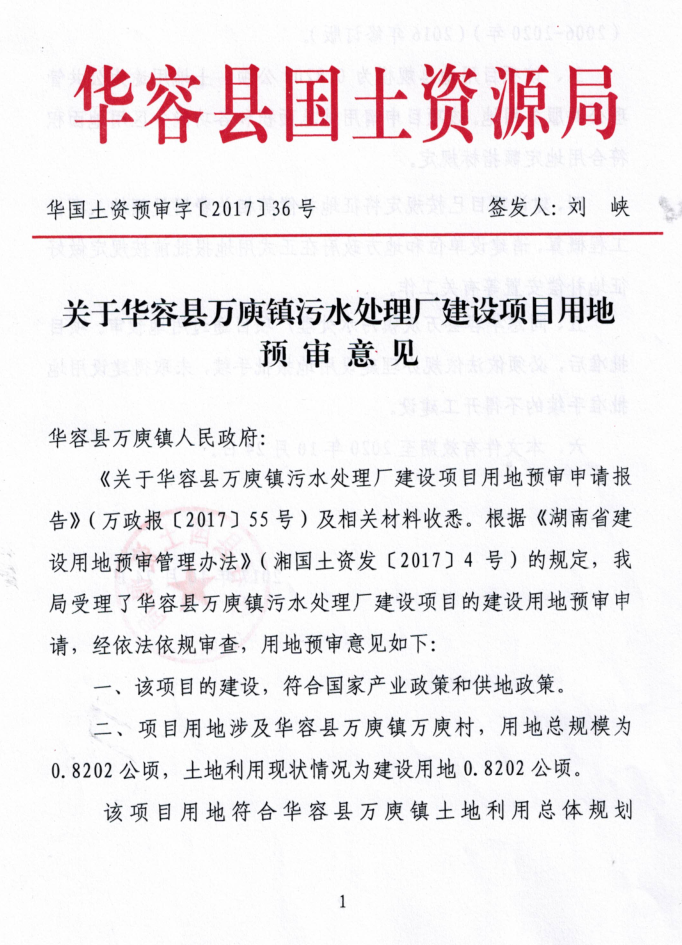 关于华容县万庾镇污水处理厂建设项目用地预审意见