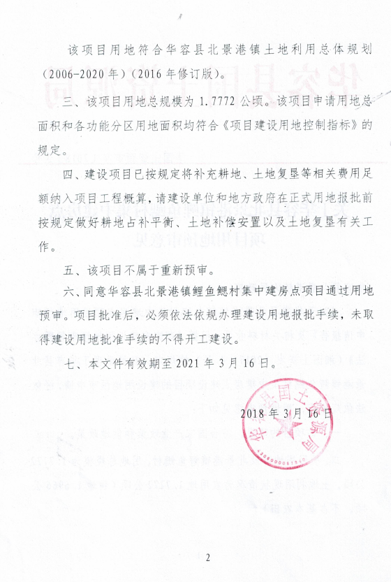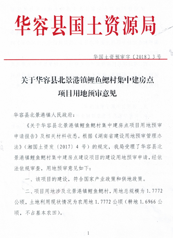 关于华容县北景港镇鲤鱼鳃村集中建房点项目用地预审意见