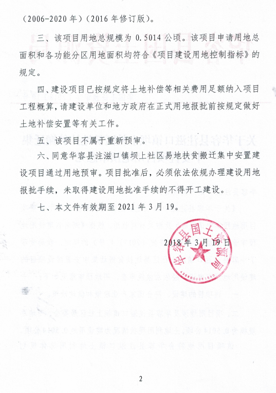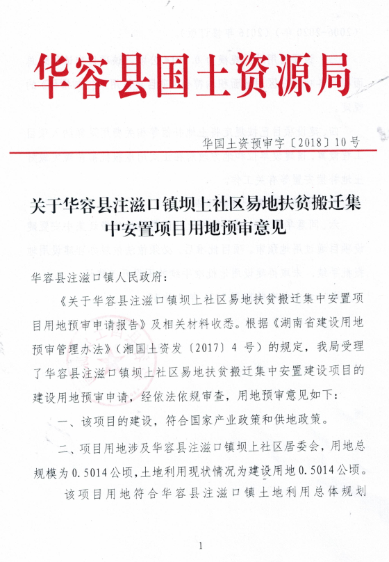 关于华容县注滋口镇坝上社区易地扶贫搬迁集中安置项目用地预审意见
