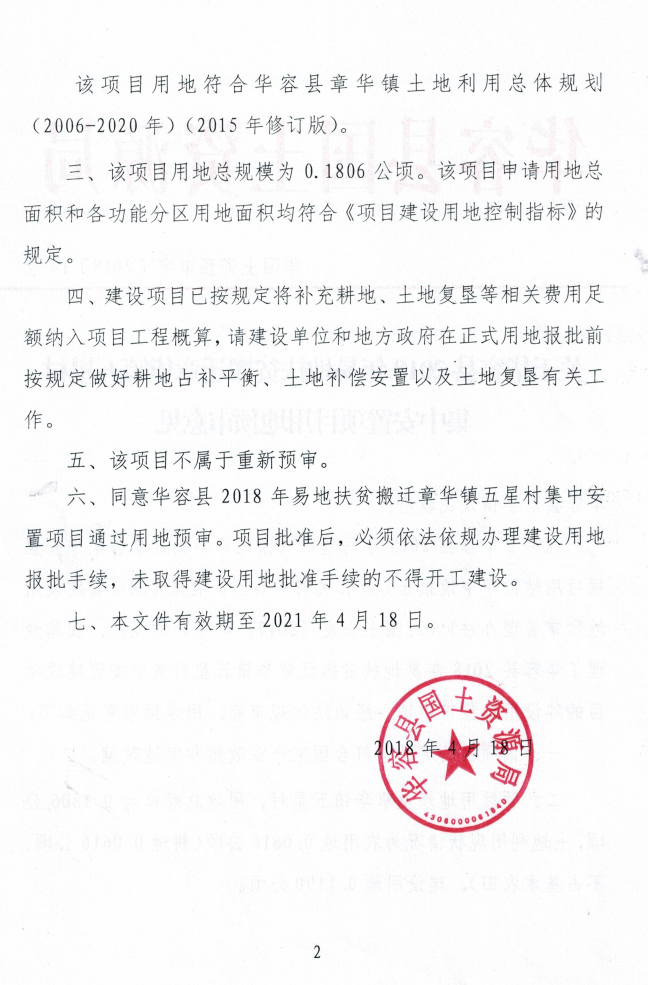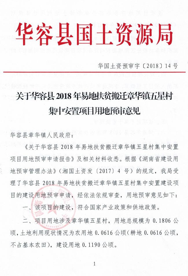 关于华容县2018年易地扶贫搬迁章华镇五星村集中安置项目用地预审意见