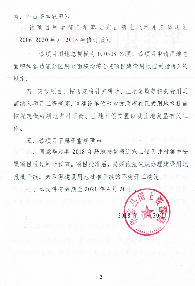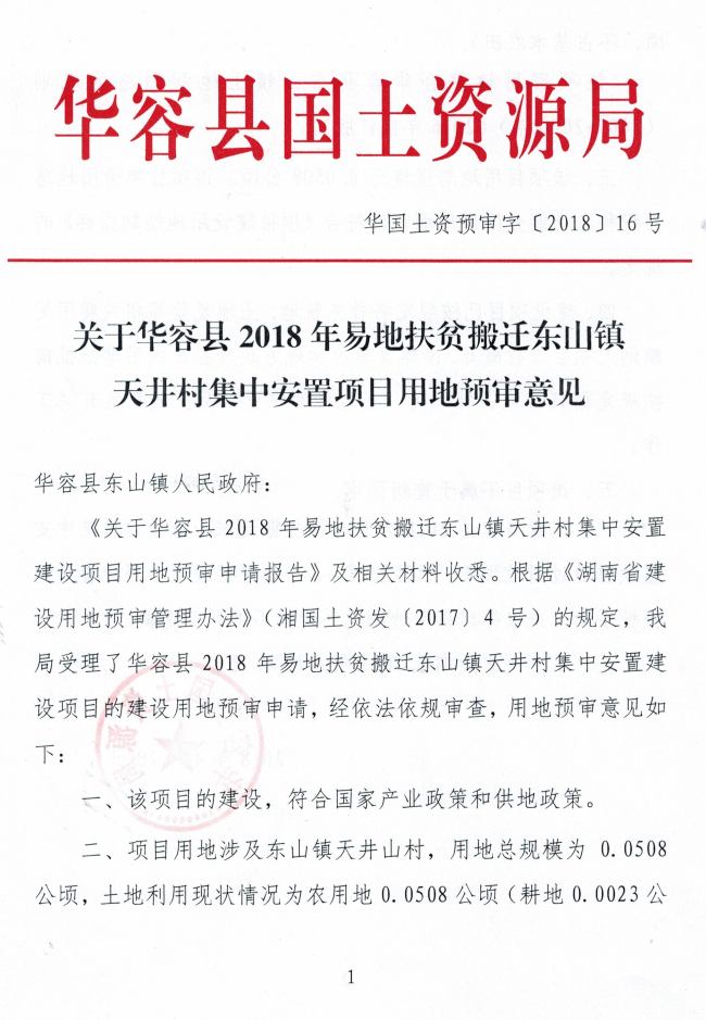 关于华容县2018年易地扶贫搬迁东山镇天井村集中安置项目用地预审意见