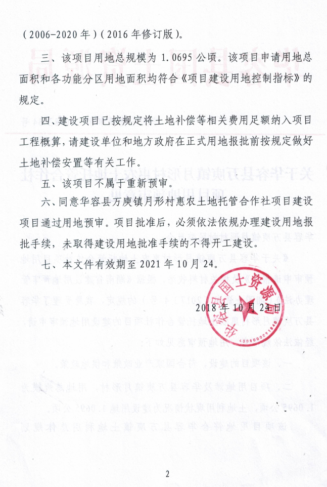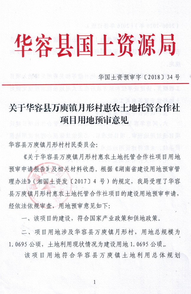 关于华容县万庾镇月形村惠农土地托管合作社项目用地预审意见