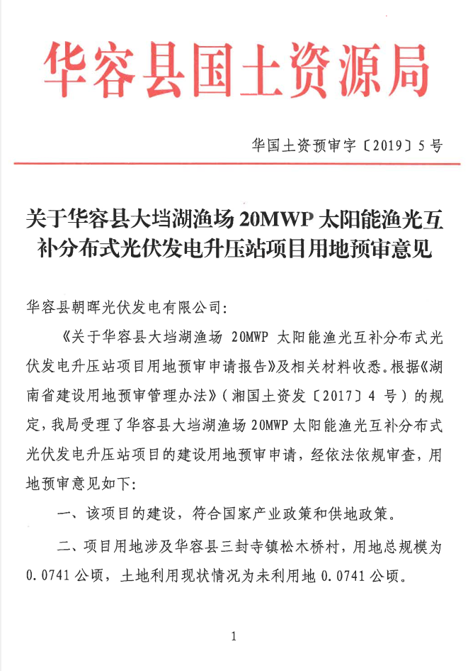 关于华容县大垱湖渔场20MWP渔光互补分布式光伏发电升压站项目用地预审意见