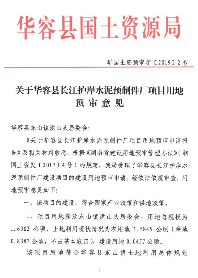 关于长江护岸水泥预制件厂项目用地预审意见