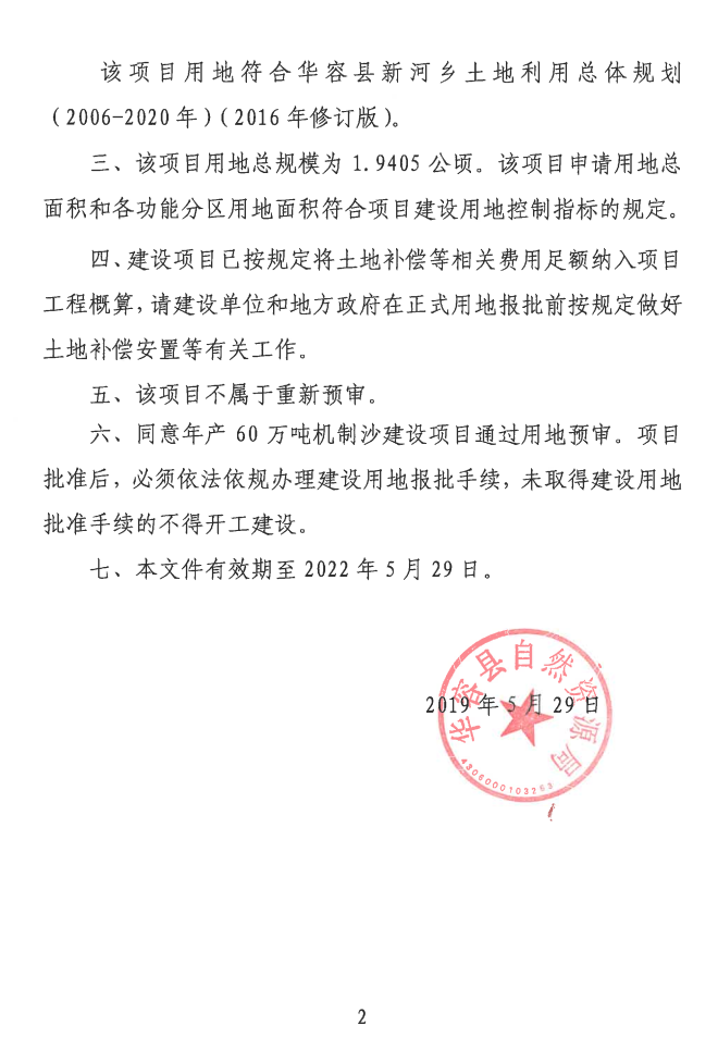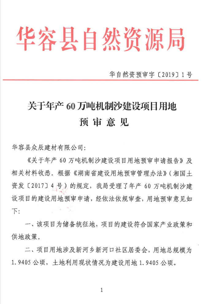 关于年产60万吨机制沙建设项目用地预审意见