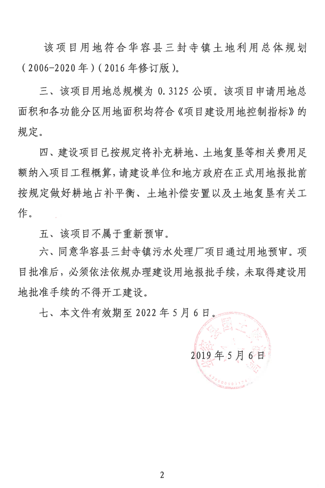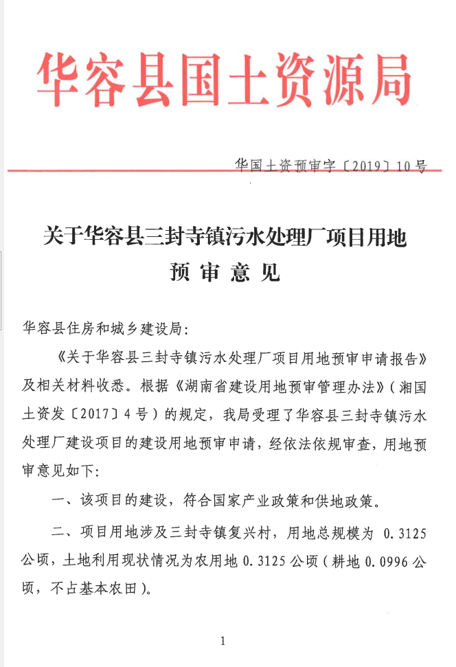关于华容县三封寺镇污水处理厂项目用地预审意见