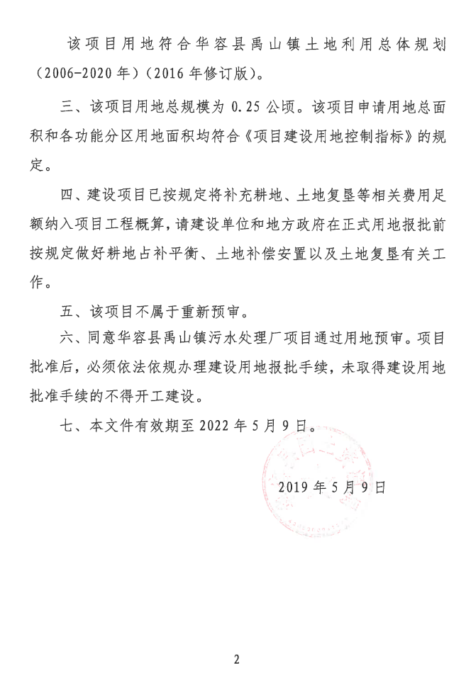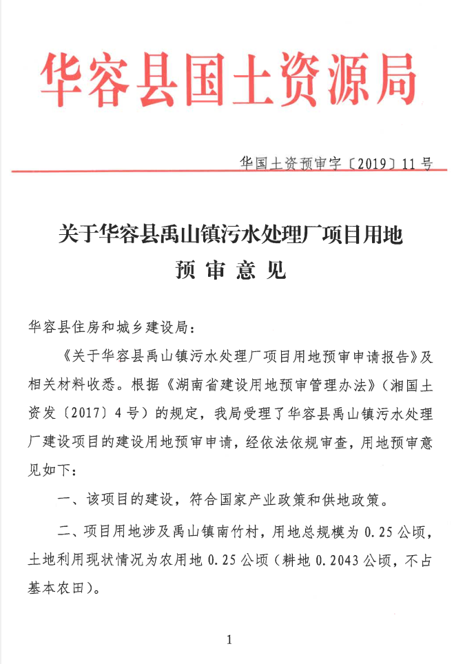 关于华容县禹山镇污水处理厂项目用地预审意见