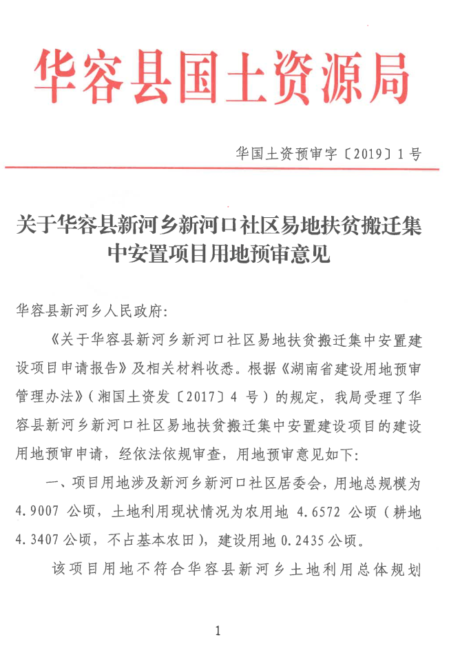 关于华容县新河乡新河口社区易地扶贫搬迁集中安置项目用地预审意见