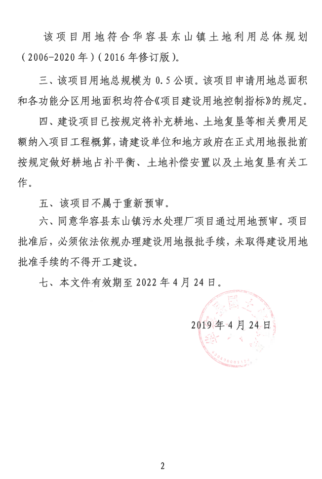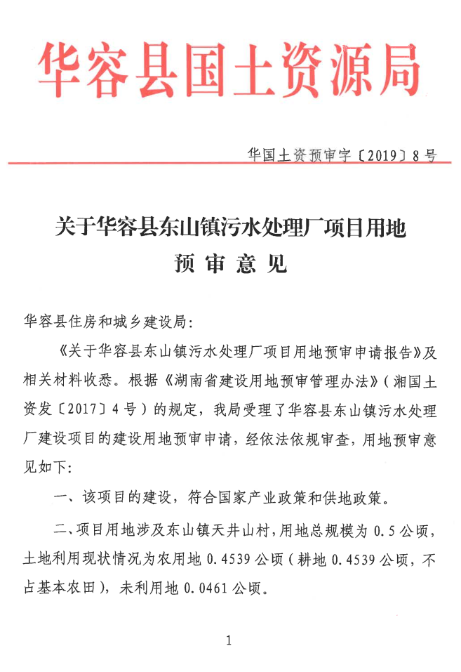 关于华容县东山镇污水处理厂项目用地预审意见