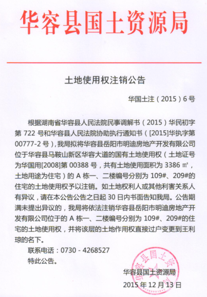 华容县国土资源局土地使用权注销公告【华国土注(2015)6号】