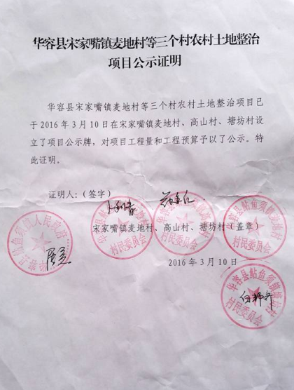 华容县宋家嘴镇麦地村等三个村农村土地整治项目公示证明