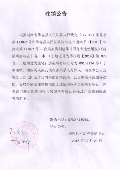注销公告【刘建华(国有土地使用证:华国用2014第073号\房屋所有权证:00108324号)】