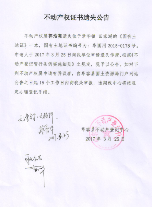 不动产权证书遗失公告【国有土地证(郭浩亮)】